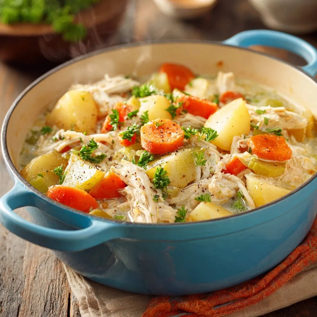 Discover the secret to moist, tender chicken in this hearty chicken and veggie stew. A comforting, perfectly cooked meal.