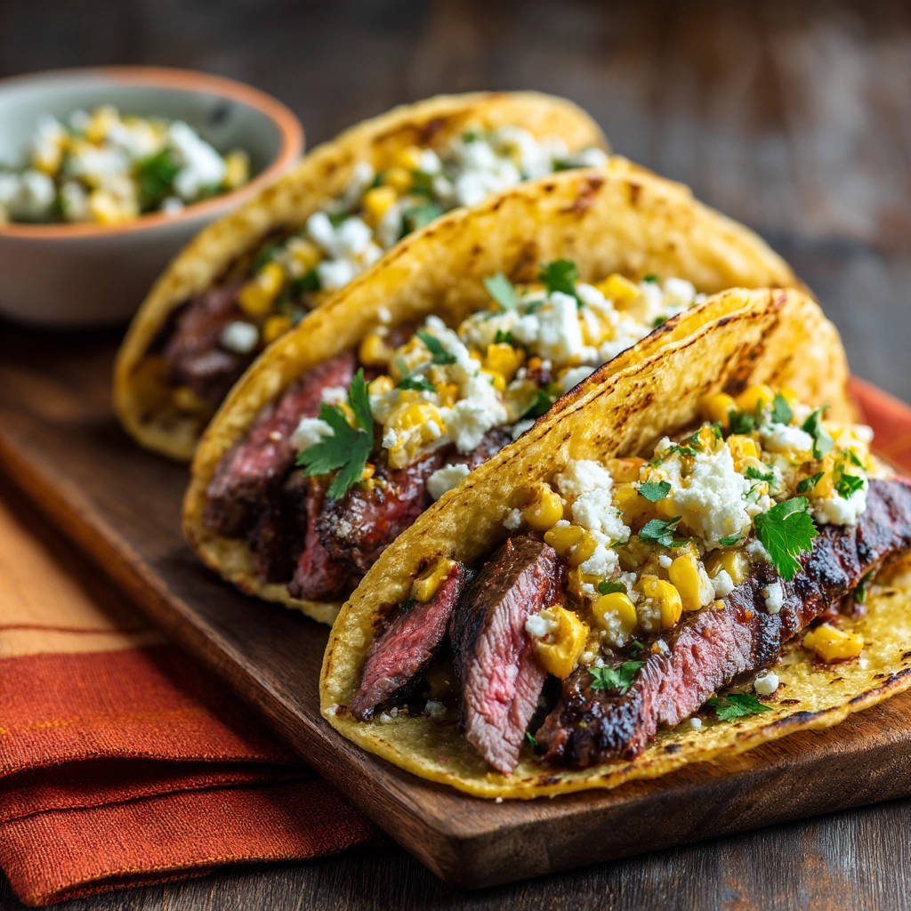- Assemble the tacos: Place some sliced steak on each warm tortilla, top with the corn and tomato salsa mixture, crumbled cheese, and extra fresh cilantro. Serve immediately.