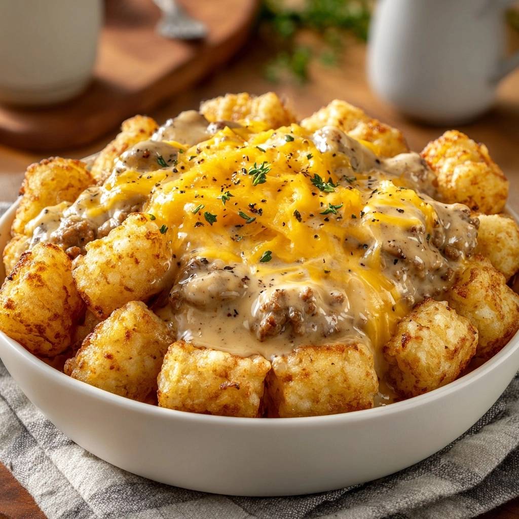 A hearty breakfast bowl featuring extra-crispy tater tots topped with thick sausage gravy and melted cheddar cheese, designed to stay crunchy and delicious.