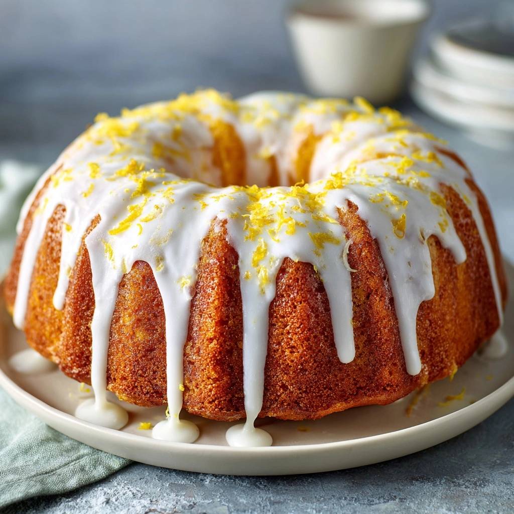 A foolproof lemon bundt cake recipe featuring a specific cake goop coating technique to ensure a perfect release every time, topped with a thick opaque white glaze.