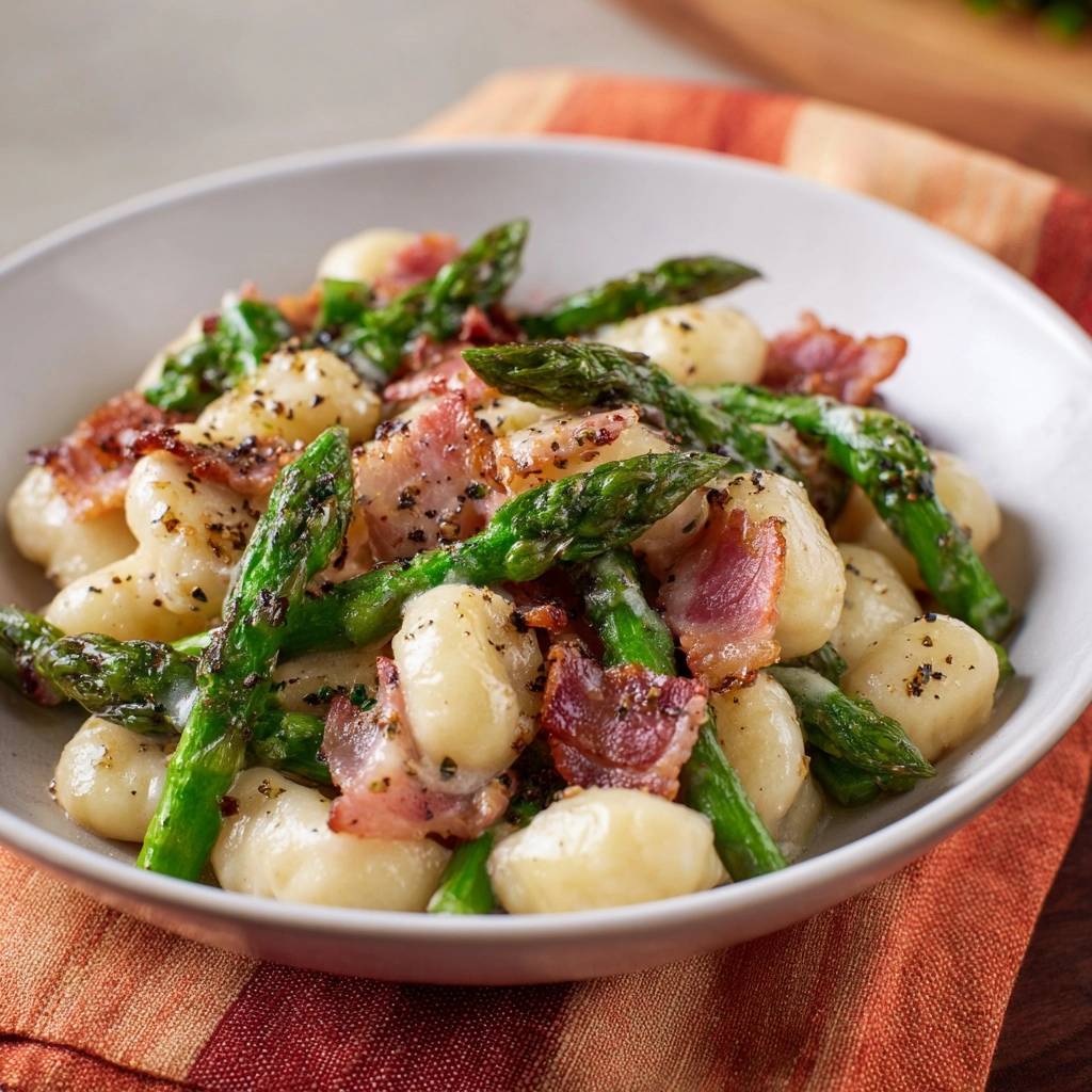 Learn how to make crispy pan-seared gnocchi with asparagus and bacon using a skillet-only method that prevents mushy texture.
