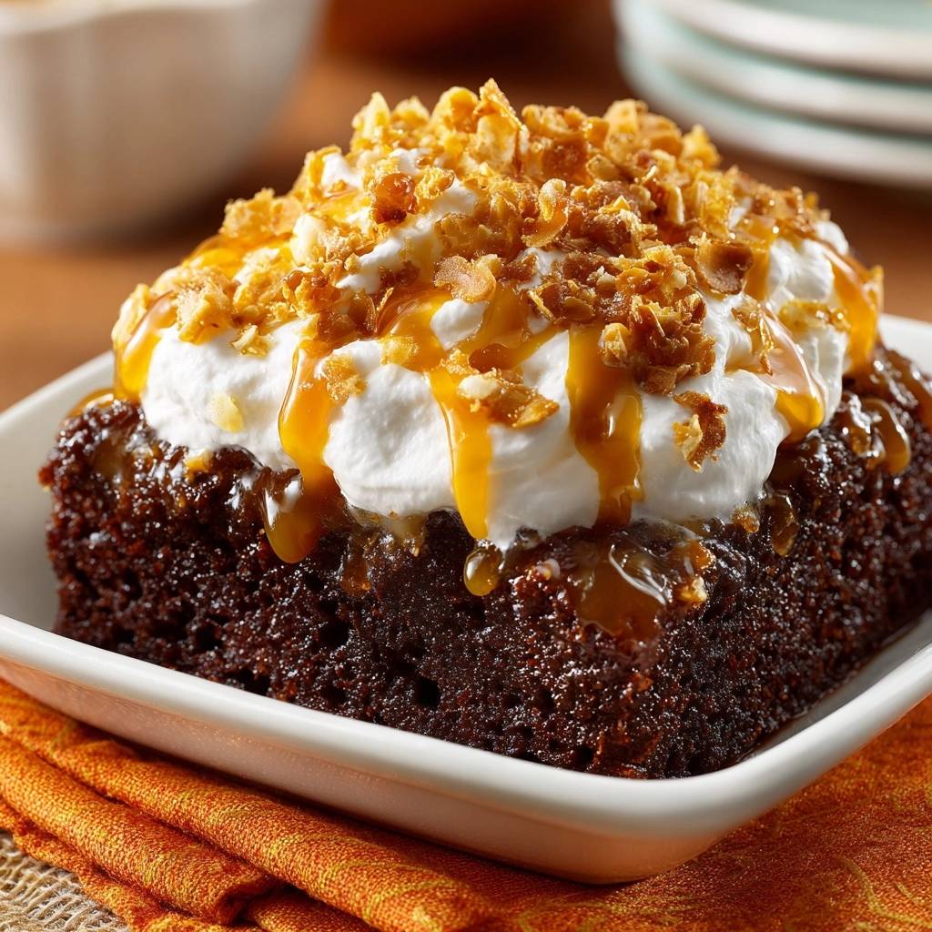 A rich chocolate poke cake featuring a specific temperature-timed infusion method to prevent a soggy bottom, topped with caramel and crunchy toffee bits.