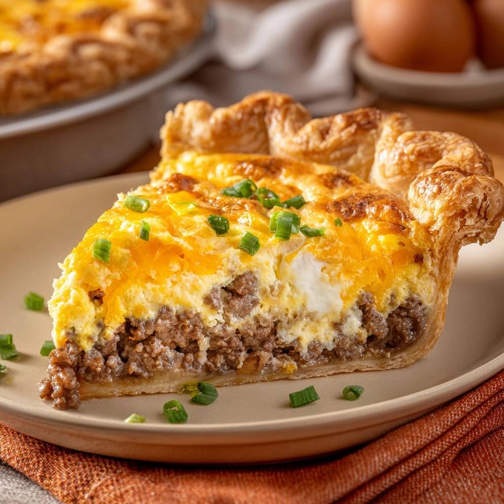 A foolproof savory breakfast pie featuring lean ground beef and sharp cheddar with a specialized par-baking technique to ensure a crisp, flaky crust every time.