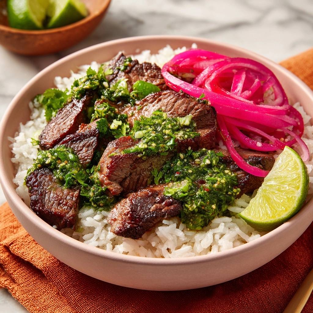 Learn how to make tender Chimichurri Steak Rice Bowls with a secret technique to end tough, chewy meat. Includes quick pickled onions and a fresh herb sauce.