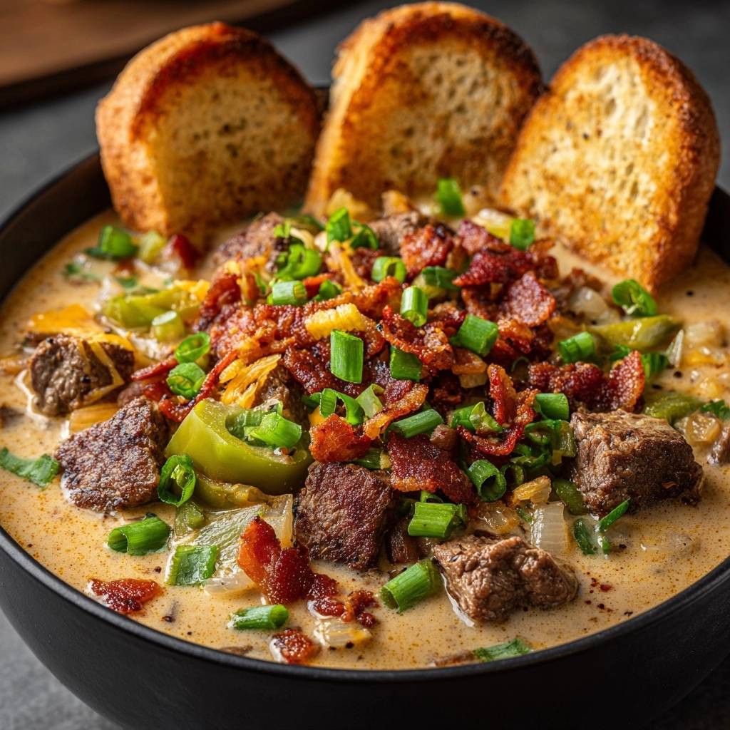 A velvety, restaurant-quality cheesesteak soup featuring a smooth, creamy base that never curdles or turns grainy thanks to a specific tempering technique.