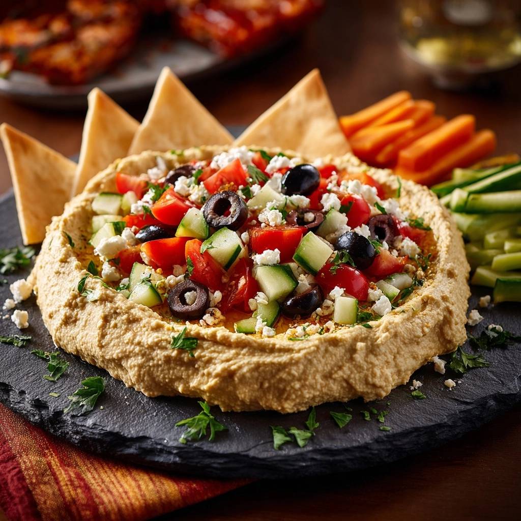 A rustic and creamy loaded hummus platter topped with fresh cucumbers, tomatoes, Kalamata olives, and feta cheese. Perfect for sharing with pita and vegetables.