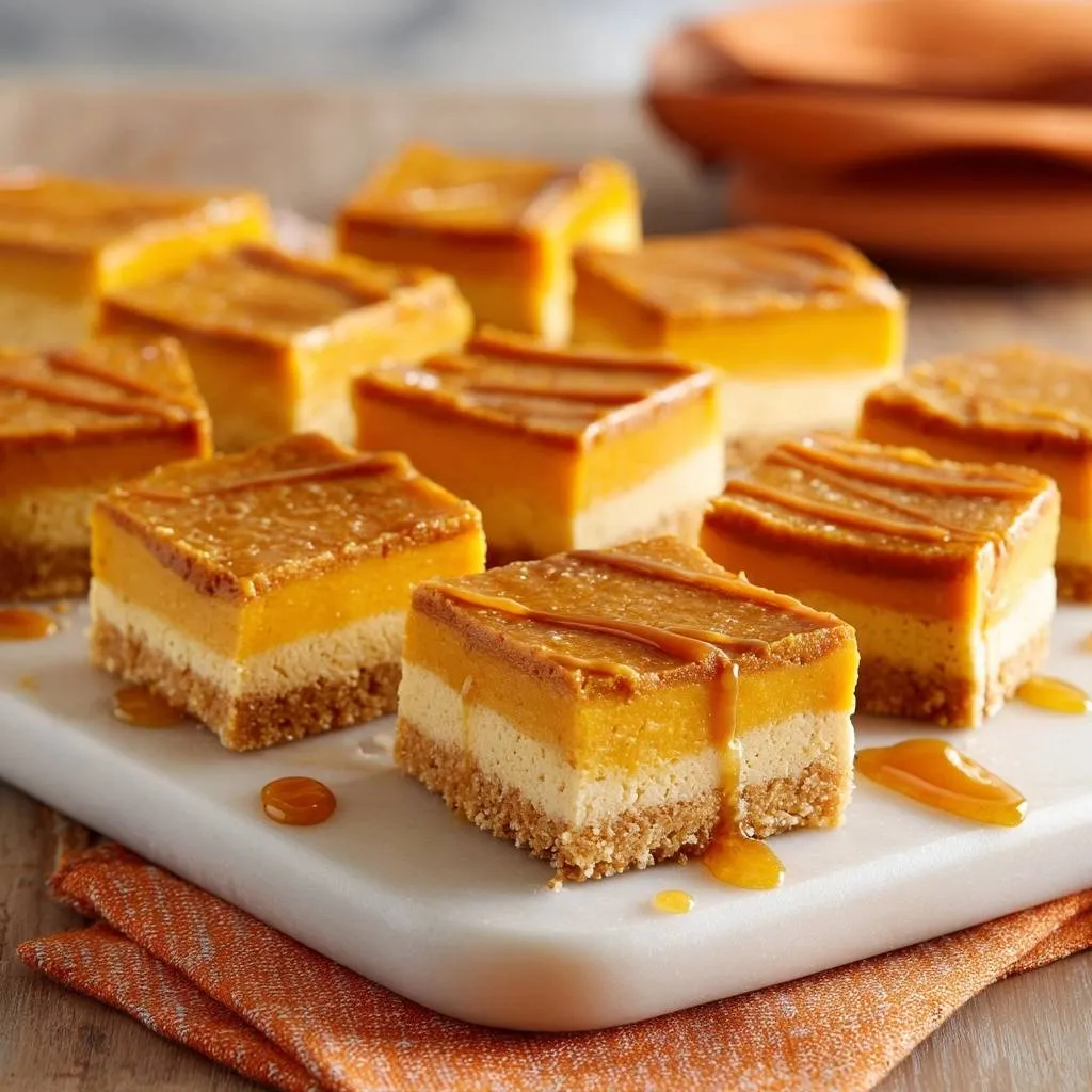 Professional bakery-style pumpkin cheesecake bars featuring a crisp graham cracker crust and distinct creamy layers. The pre-baking technique ensures a perfect texture without a soggy bottom.