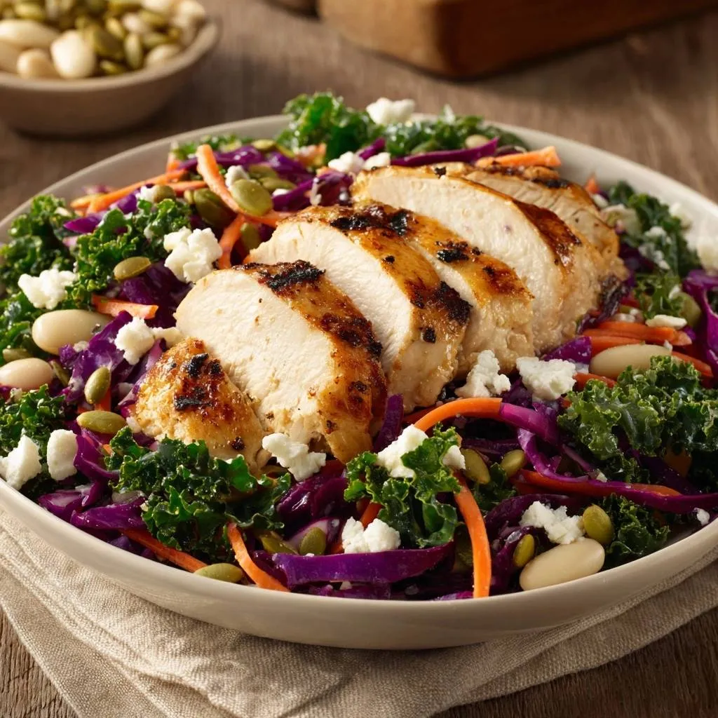 Learn the secret to a non-soggy kale salad with this high-protein recipe featuring grilled chicken, massaged kale, and crunchy cabbage.