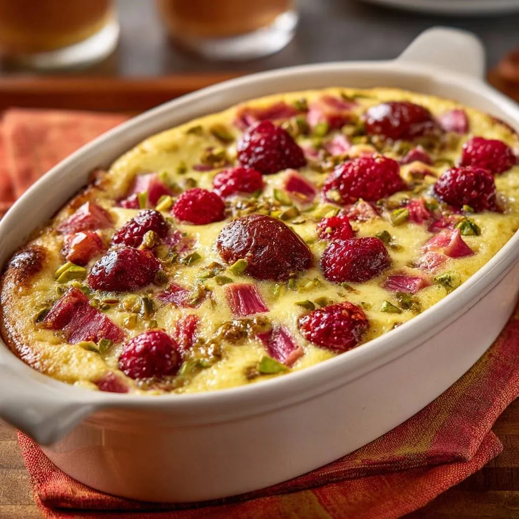 A firm and velvety custard bake featuring a secret cornstarch coating technique to prevent soggy fruit bottoms, topped with tart raspberries and crunchy pistachios.