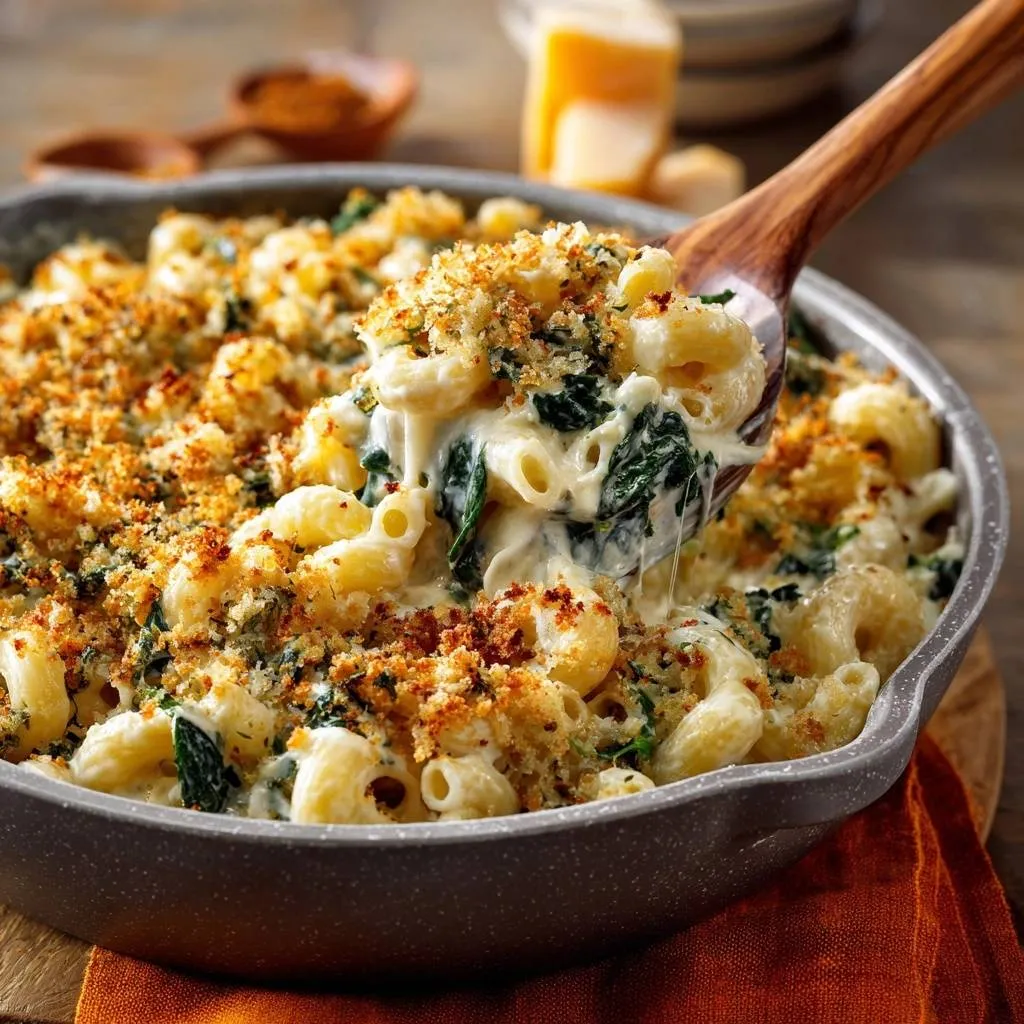 A foolproof baked mac and cheese recipe featuring a moisture-lock technique to prevent watery spinach and ensure a thick, velvety cheese sauce with a crispy Panko topping.