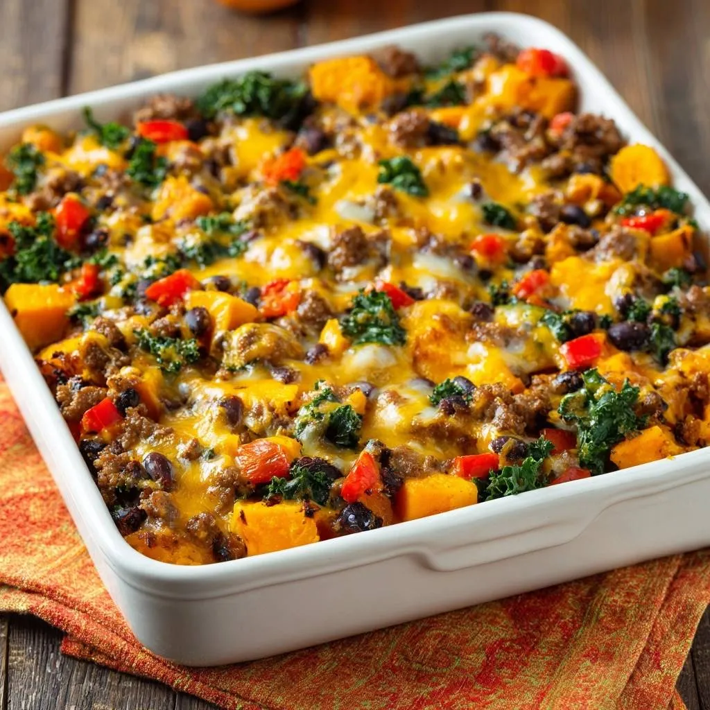 A delicious, non-soggy vegetable and beef casserole featuring roasted sweet potatoes, crisp kale, and melted cheddar cheese.
