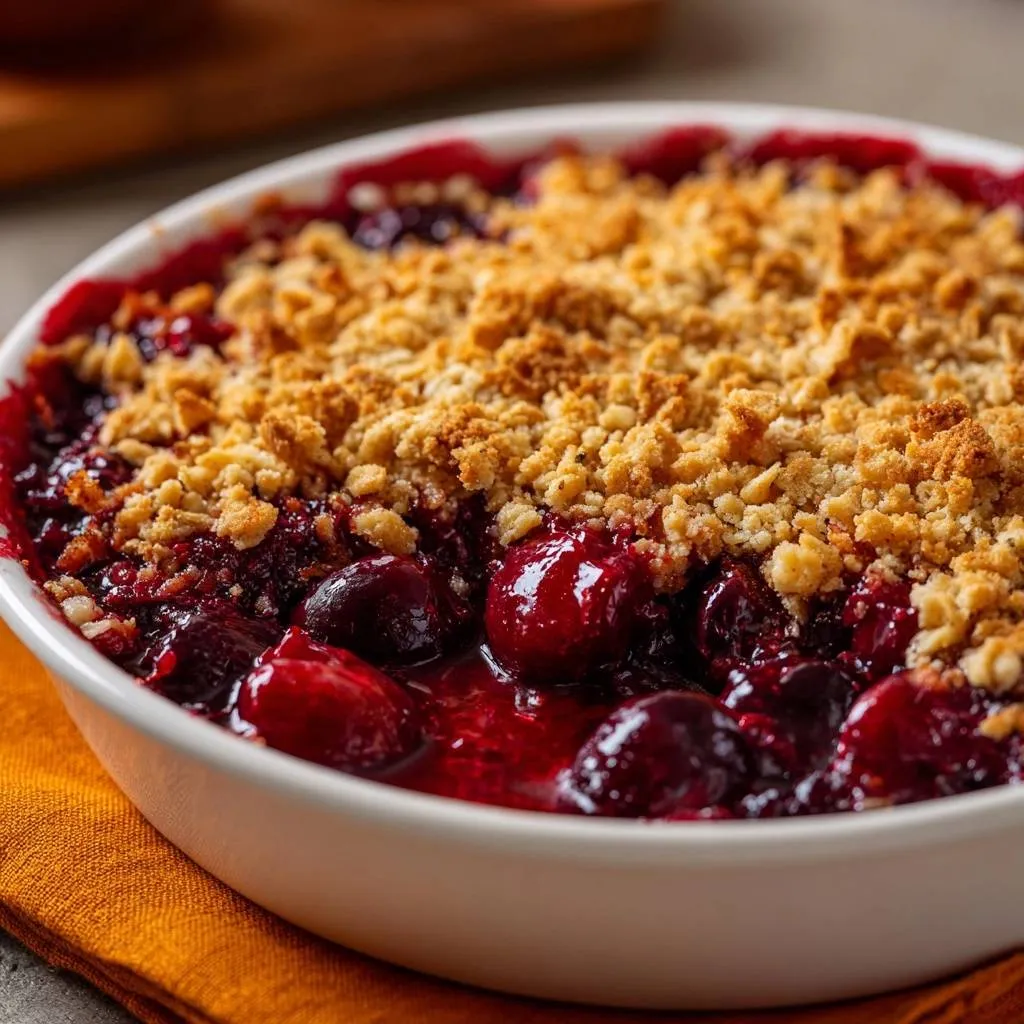 A foolproof cherry crumble recipe featuring a thick, jammy filling and a perfectly crunchy almond flour topping that never gets soggy.