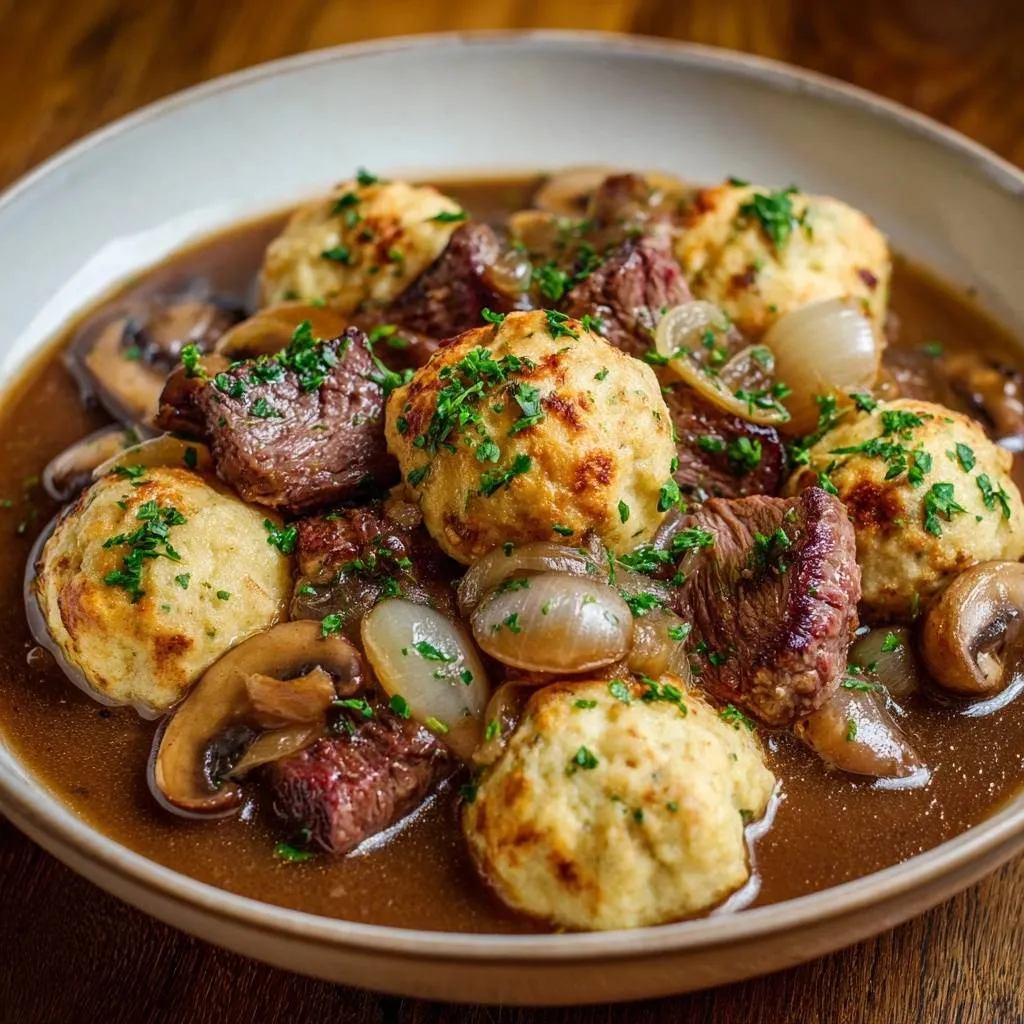 A hearty beef stew featuring a unique ‘perching’ technique to ensure light, fluffy dumplings with a golden, toasted crust instead of a soggy texture.