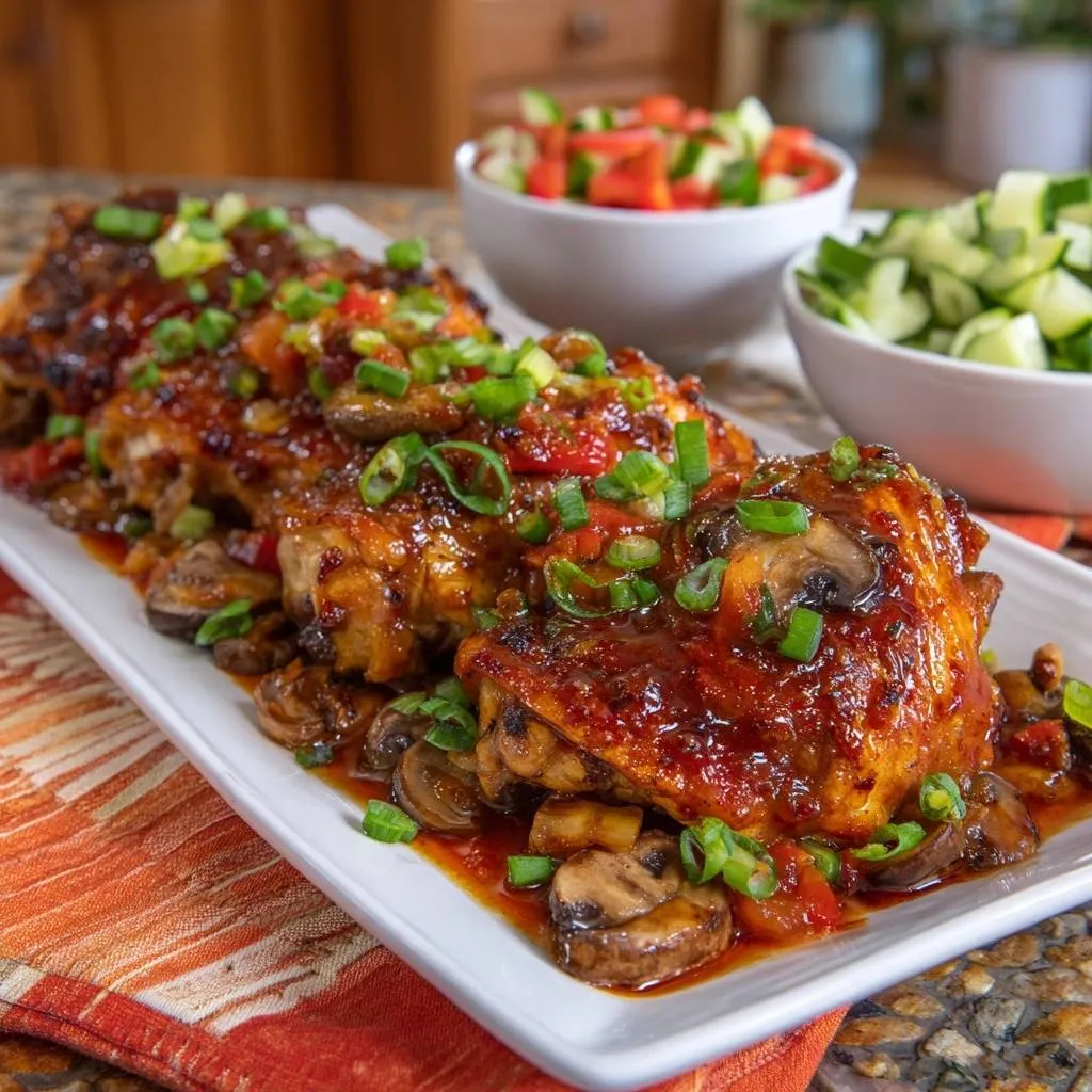 Master the secret to crispy skin with this glazed chicken thigh recipe featuring cremini mushrooms, red peppers, and a savory honey-soy reduction.