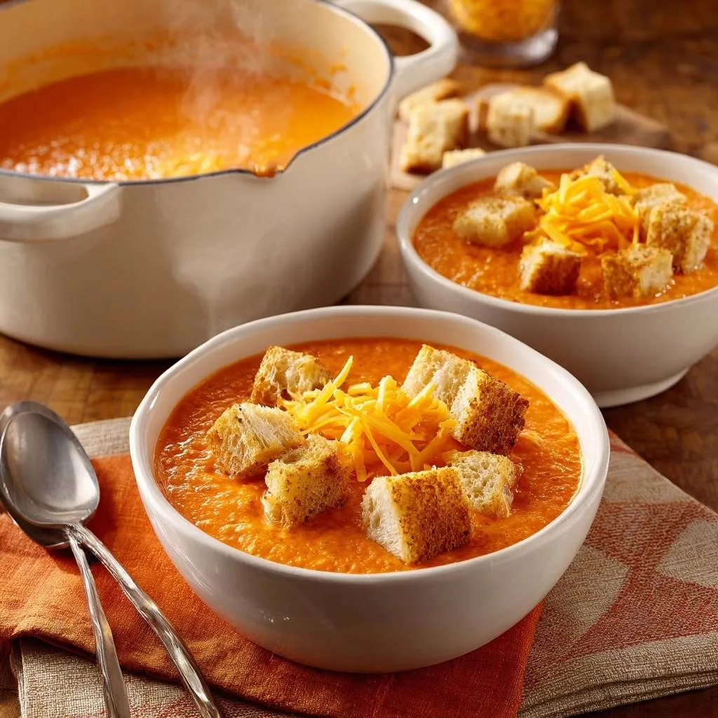 A rich, velvety roasted tomato soup made with caramelized vegetables and heavy cream, topped with buttery sourdough croutons and sharp cheddar cheese.