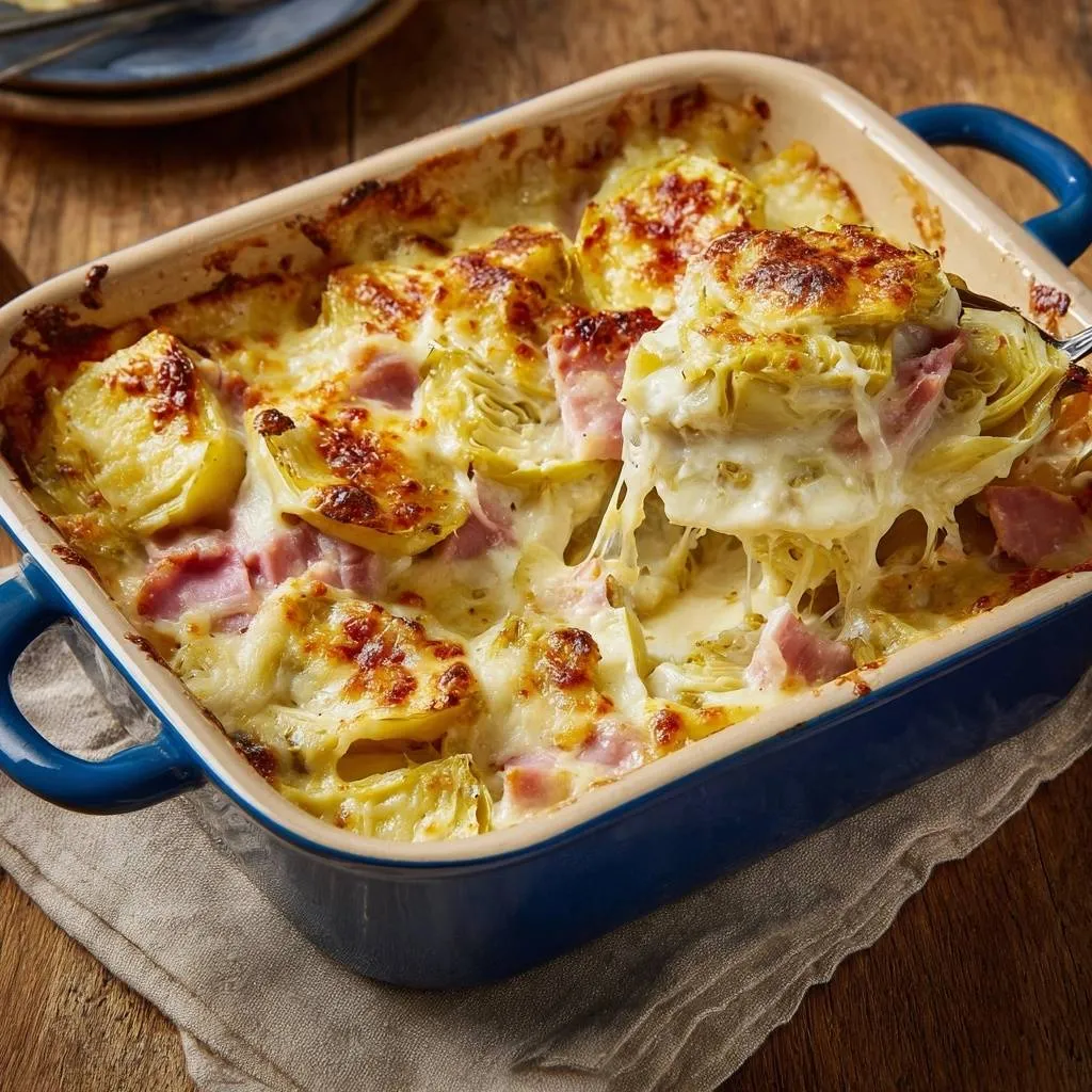 A rich and creamy artichoke and ham casserole featuring a stabilized Mornay-style sauce and a moisture-locking technique to prevent a watery finish.