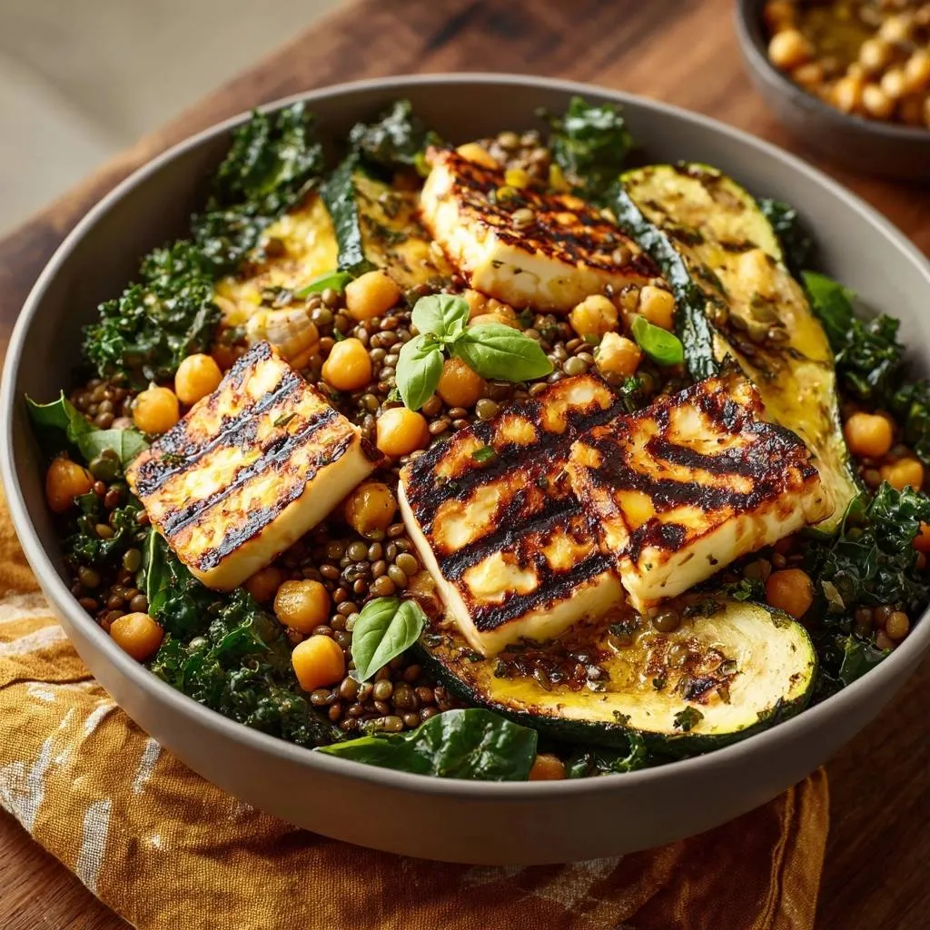 Master the art of perfectly seared halloumi with this protein-packed power bowl featuring French lentils, crispy chickpeas, and charred zucchini.