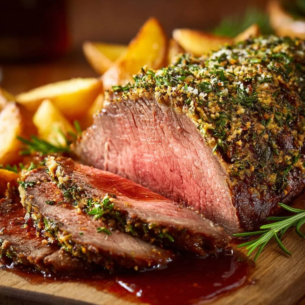 Master the secret to a perfectly crunchy, non-soggy herb crust with this roast beef recipe featuring golden Yukon potatoes and a rich red wine jus.