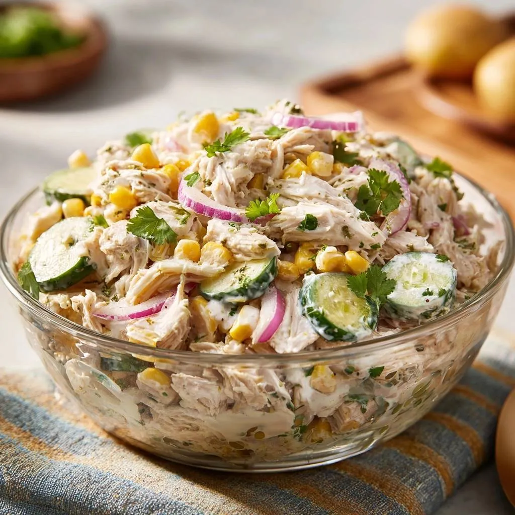 A creamy chicken and corn salad featuring a salt-and-drain cucumber hack to prevent sogginess and ensure a thick, velvety dressing.