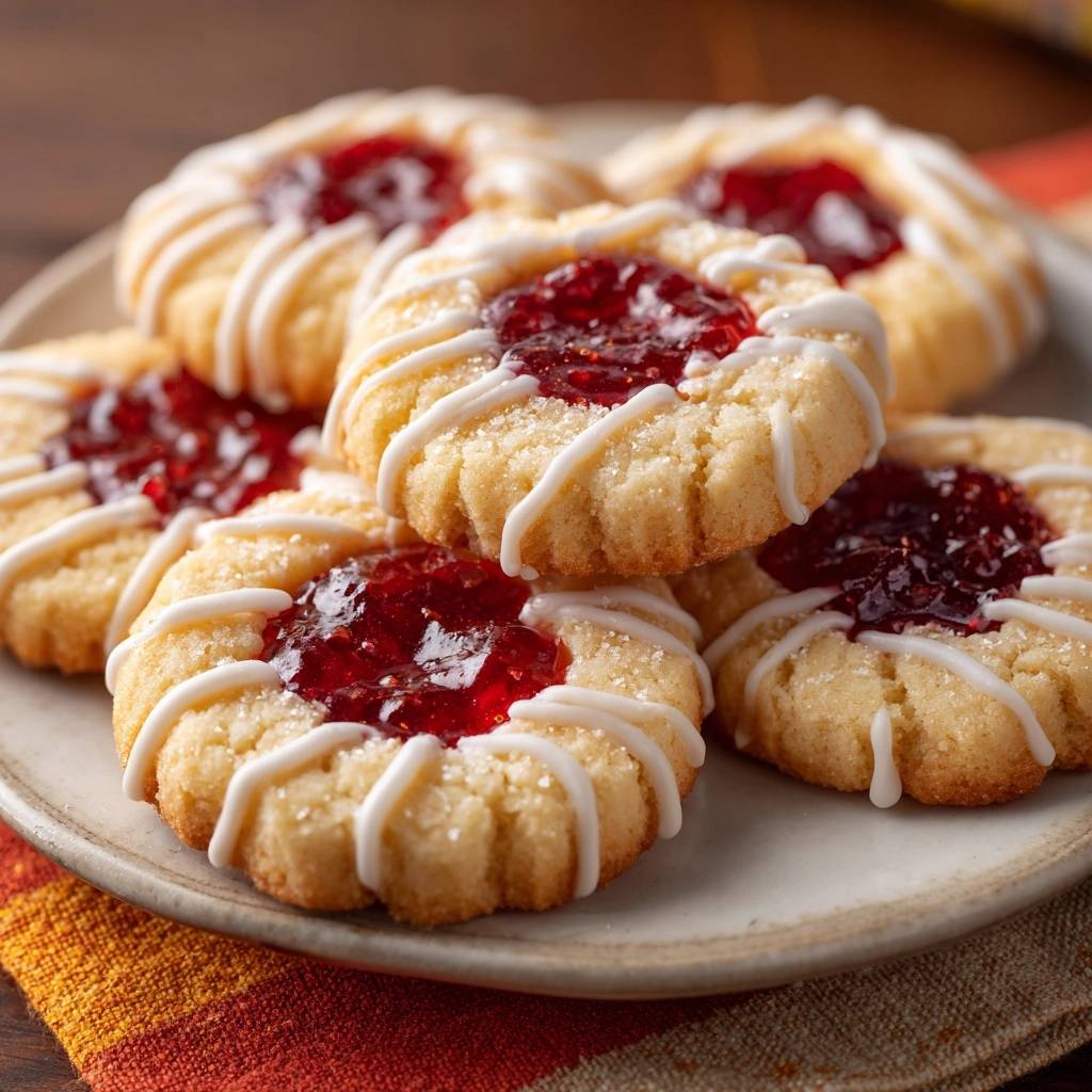 Learn the no-spread secret for perfect raspberry thumbprint cookies featuring fluted edges, a buttery base, and a sweet almond glaze.