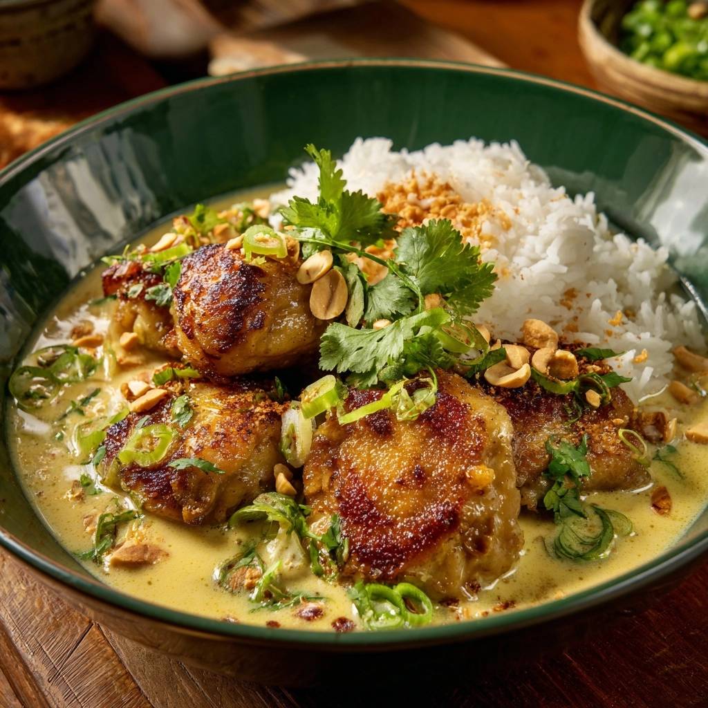 Learn the secret to perfectly crispy skin chicken curry using a cold-start searing method and a two-stage plating technique to prevent soggy skin.