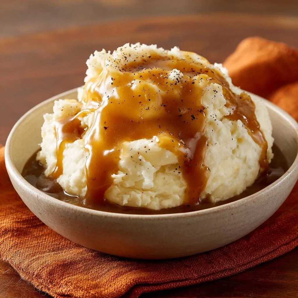 Learn the secret to perfect, non-gummy mashed potatoes with this garlic-infused recipe featuring a rich, savory brown gravy.