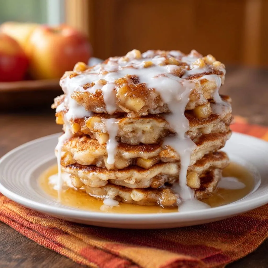 Fluffy apple cinnamon roll pancakes with caramelized apples, cinnamon topping, and cream cheese icing. No soggy texture thanks to a quick apple saute!
