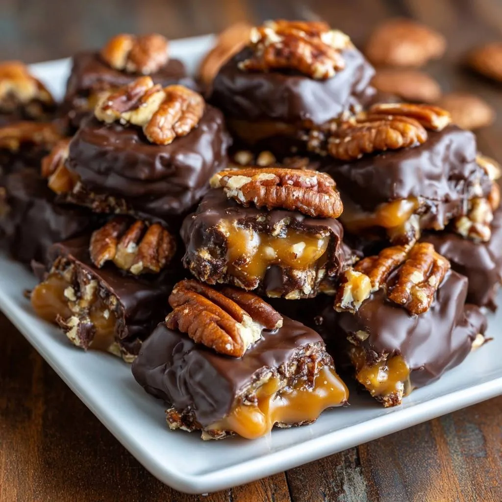Foolproof homemade chocolate pecan turtles with chewy caramel made by boiling sweetened condensed milk for exactly 12 minutes—no thermometer needed!