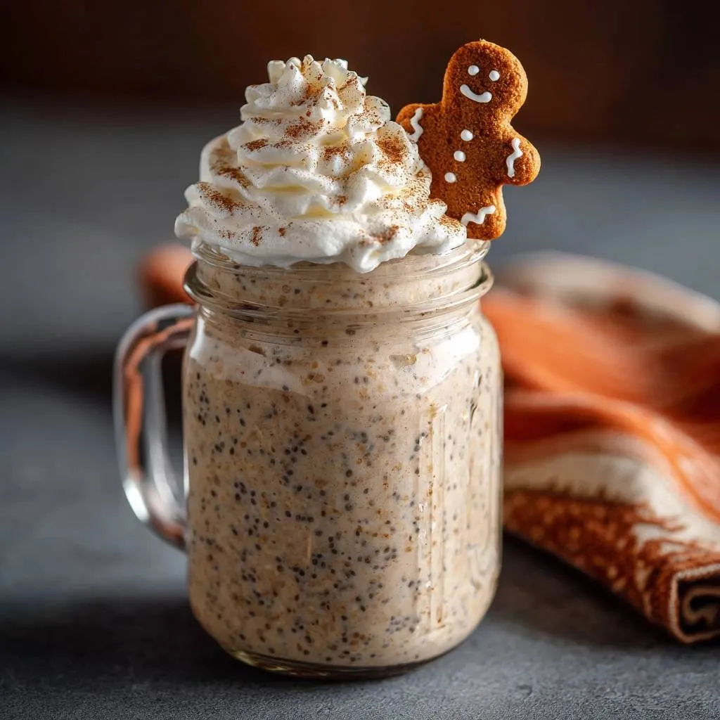 Perfect no-slimy chia overnight oats with gingerbread flavors, topped with whipped cream and a cookie for holiday cheer.