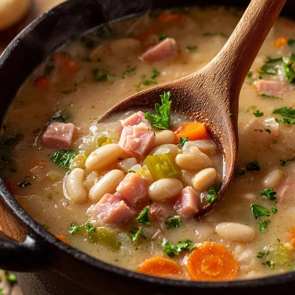 Foolproof hearty ham and white bean soup thickened by mashing beans for creamy texture without cream or flour. Perfect cozy meal.
