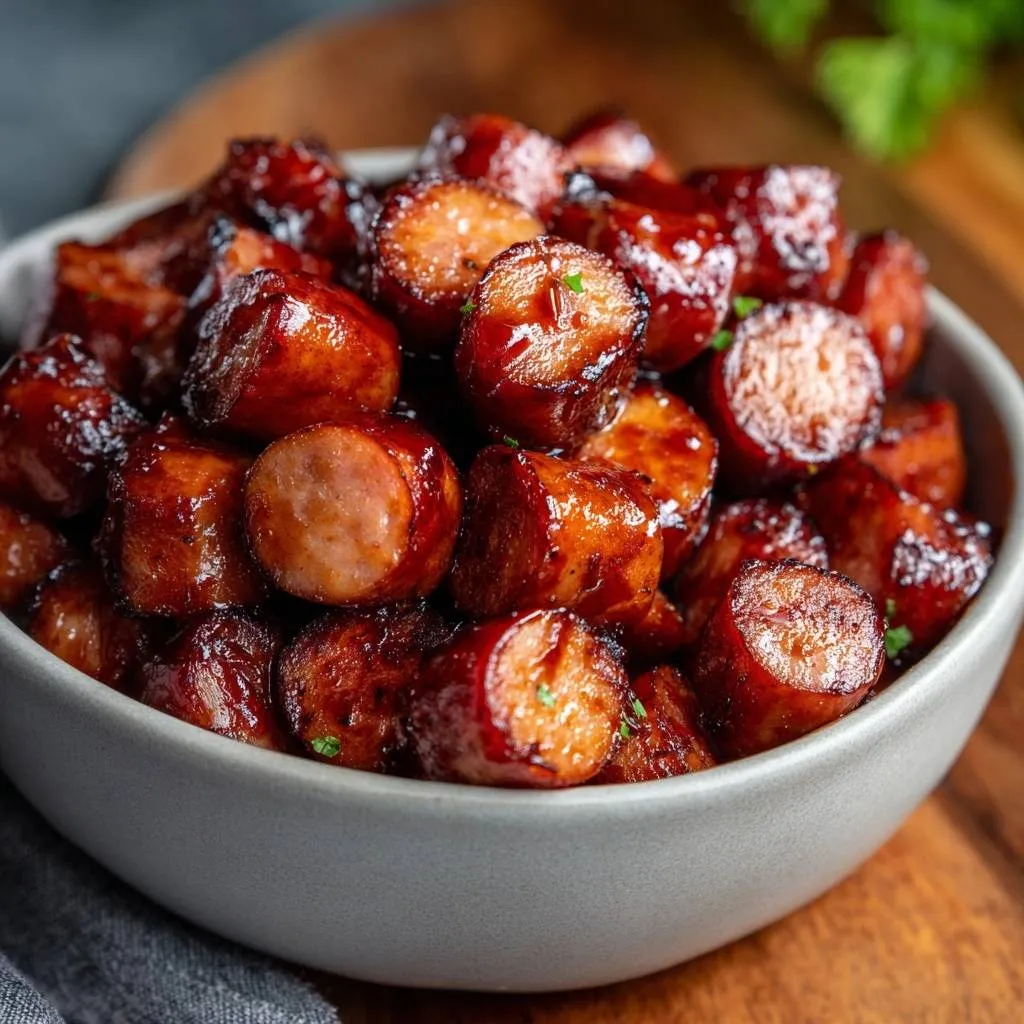Smoked sausage bites glazed in a thick, glossy BBQ sauce that clings perfectly without getting watery. Quick, easy, and flavorful!