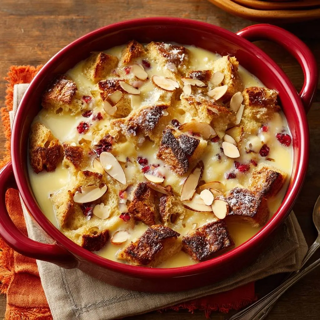 Perfect creamy bread pudding with no soggy centers, featuring dried cranberries and slivered almonds. Stale bread and a 1-hour pressed soak ensure even custard absorption.
