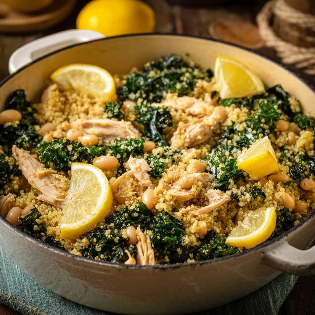 Fluffy one-pot lemon chicken quinoa with kale and white beans. Simple rinse-and-ratio trick ensures perfect texture every time.