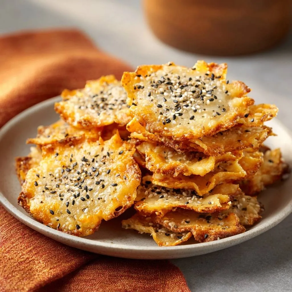 Dead-simple baked cheese crisps with black sesame seeds that stay shatteringly crisp by cooling on parchment to evaporate moisture—no fancy gear needed.