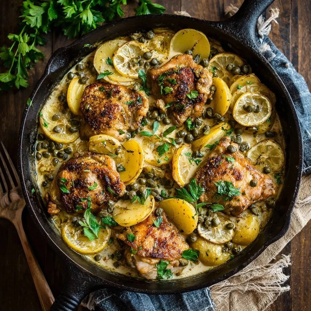 Crispy skin-on chicken thighs seared in cast iron, simmered with tender potatoes in a bright lemon caper sauce. One-pan meal with juicy chicken and no soggy skin.