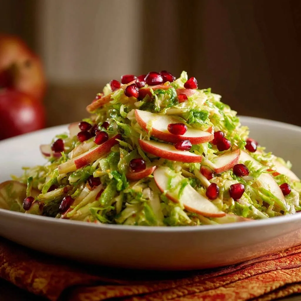 Tender-crisp Brussels sprouts salad with apples, pomegranate, and a tangy Dijon dressing. Quick salting and massaging trick eliminates chewiness without cooking.