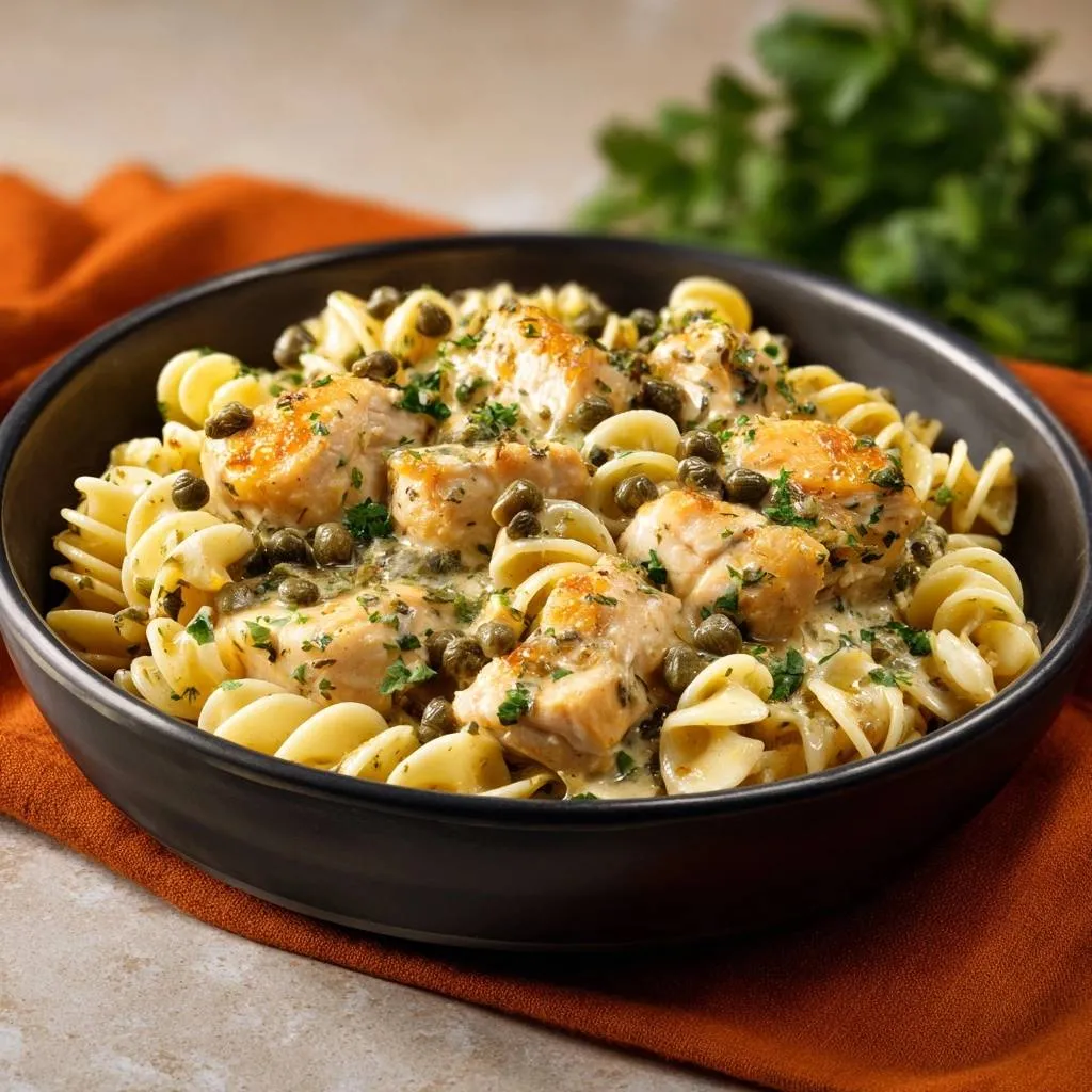 Tender, juicy chicken breast seared to perfection in a silky cream sauce with briny capers and twirly fusilli pasta. Ready in under 30 minutes!