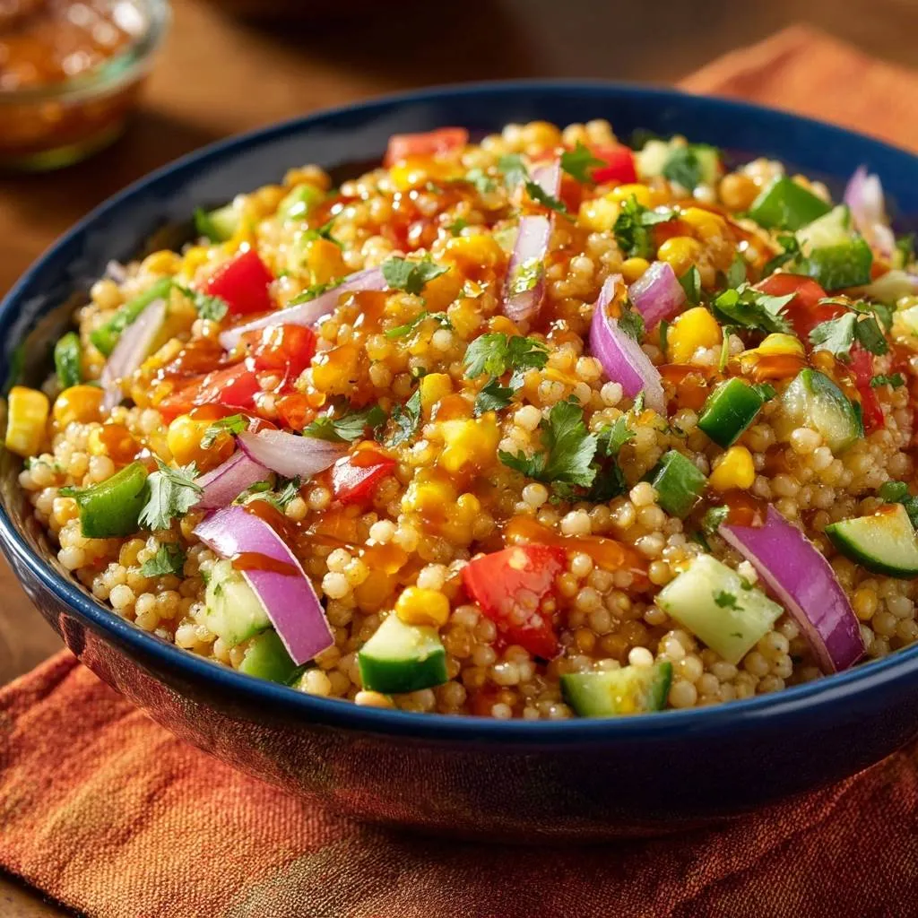 Fluffy couscous salad with crisp veggies, zesty lime dressing, and cumin – no clumping guaranteed with our steaming trick!