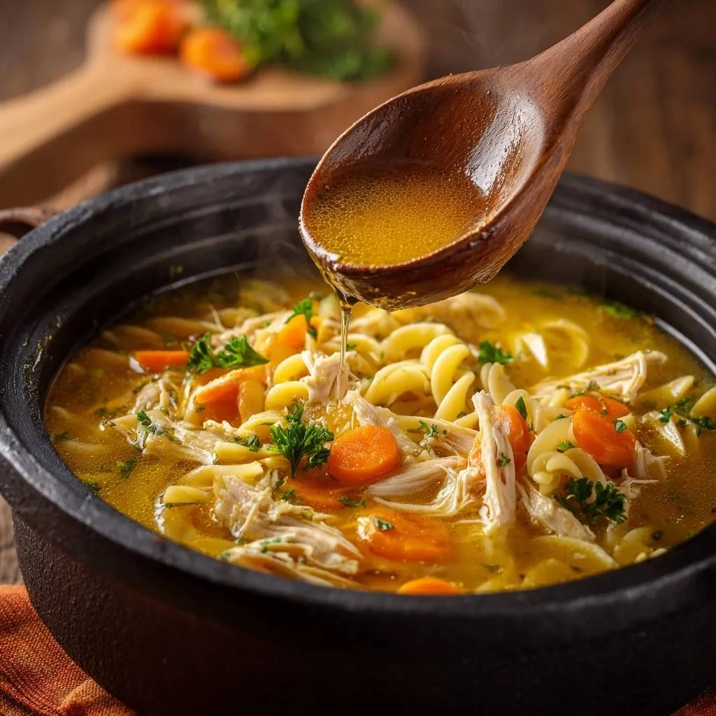 Perfect chicken noodle soup with firm, al dente rotini that stays brothy and fresh for days. Cook pasta separately and shock in cold water for no-gummy leftovers.