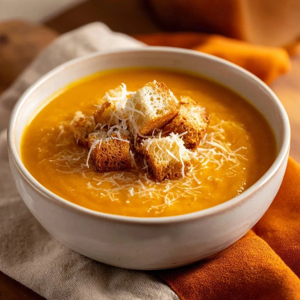 Foolproof roasted butternut squash soup with velvety texture and intense flavor, topped with crispy croutons and Parmesan.
