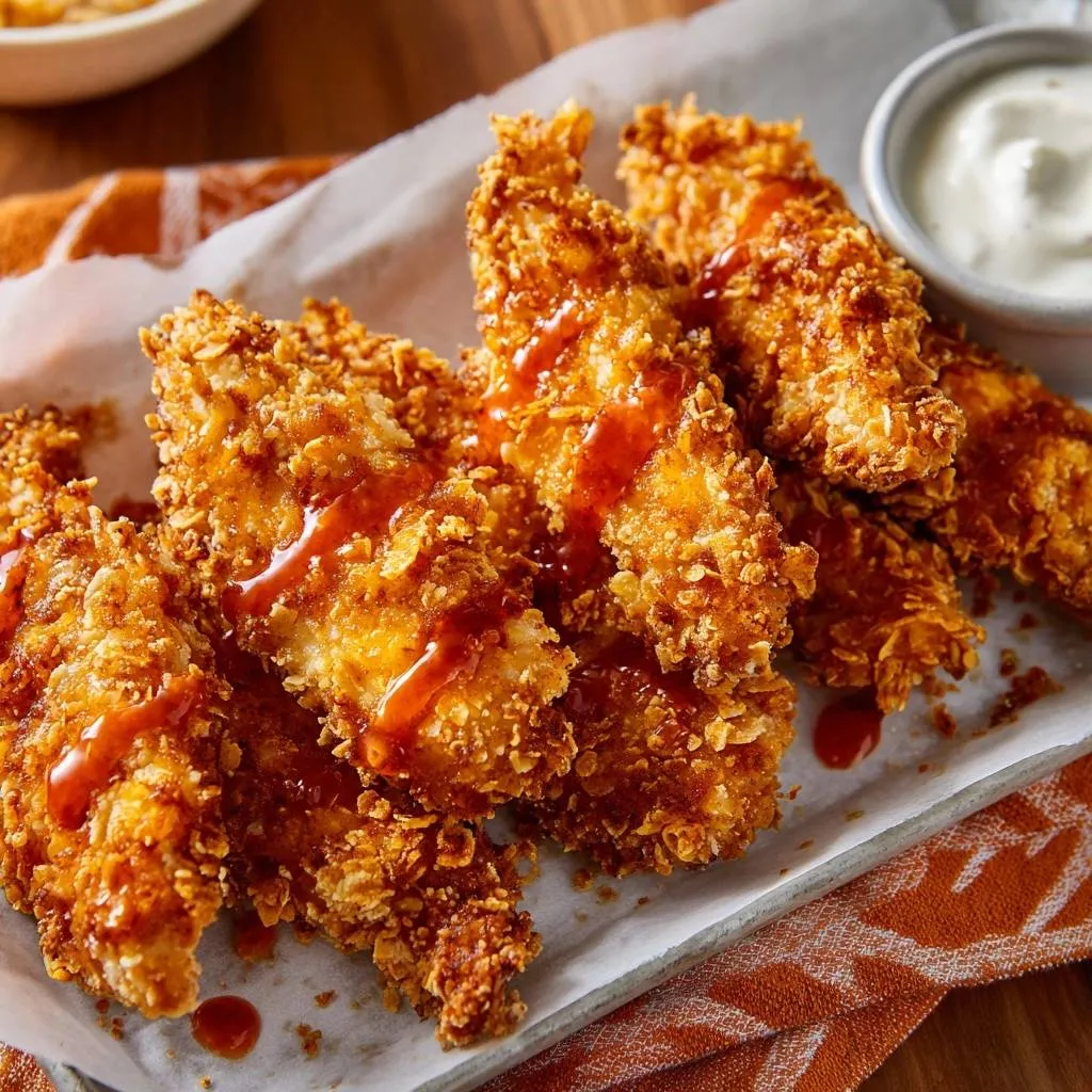 Foolproof cornflake-breaded chicken tenders baked on a wire rack for shatterproof crunch that stays crispy even under buffalo sauce. Perfect for home cooks!