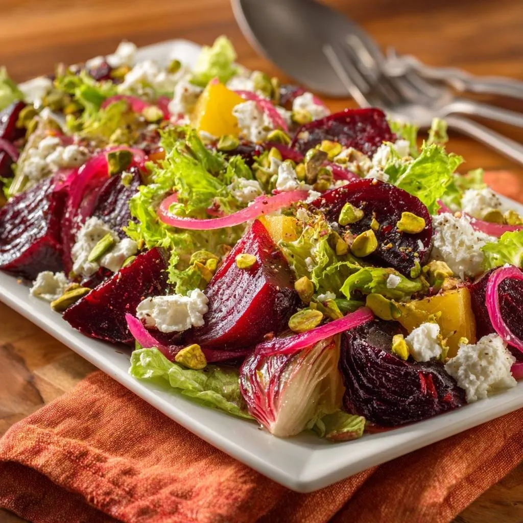 Perfectly tender roasted beets with a foolproof no-stain peeling method, paired with sweet pineapple, crunchy pistachios, tangy pickled onions, and creamy feta over crisp greens.