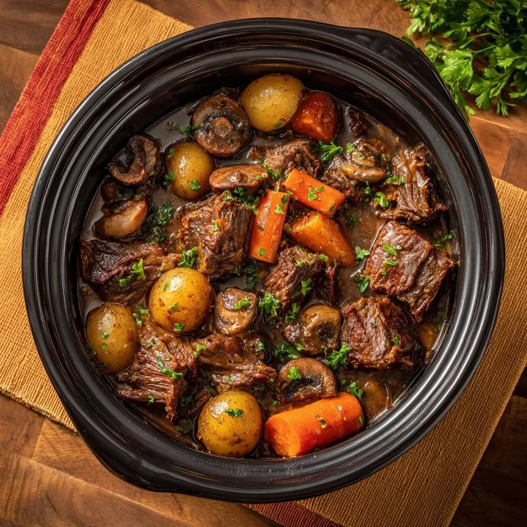 Tender, fall-apart beef stew made easy in the slow cooker. Sear beef first for restaurant-quality results—no tough meat here!