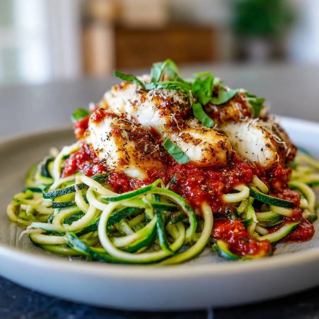 Low-carb blackened chicken with crisp zoodles in bold tomato marinara sauce. Dead-simple salting trick prevents soggy zoodles forever.
