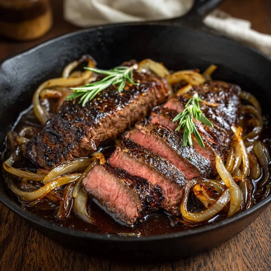 Foolproof cast iron seared ribeye steak with caramelized onions and rosemary basting for a juicy pink center every timeāno thermometer needed.