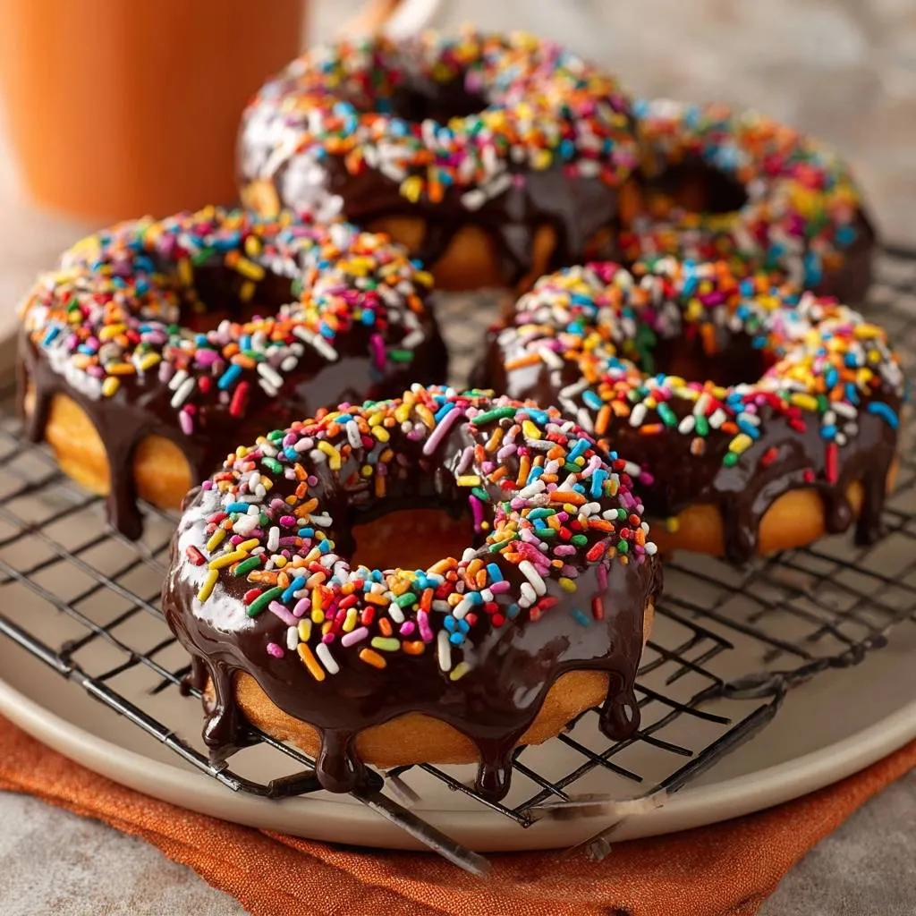 Homemade bakery-style chocolate glaze donuts with rainbow sprinkles, fried perfectly to eliminate grease. Light, fluffy, and delicious!