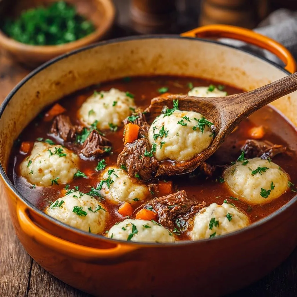 Tender beef and carrots in rich gravy topped with light, fluffy dumplings using a no-fail drop-and-steam method. Perfect cozy stew every time.