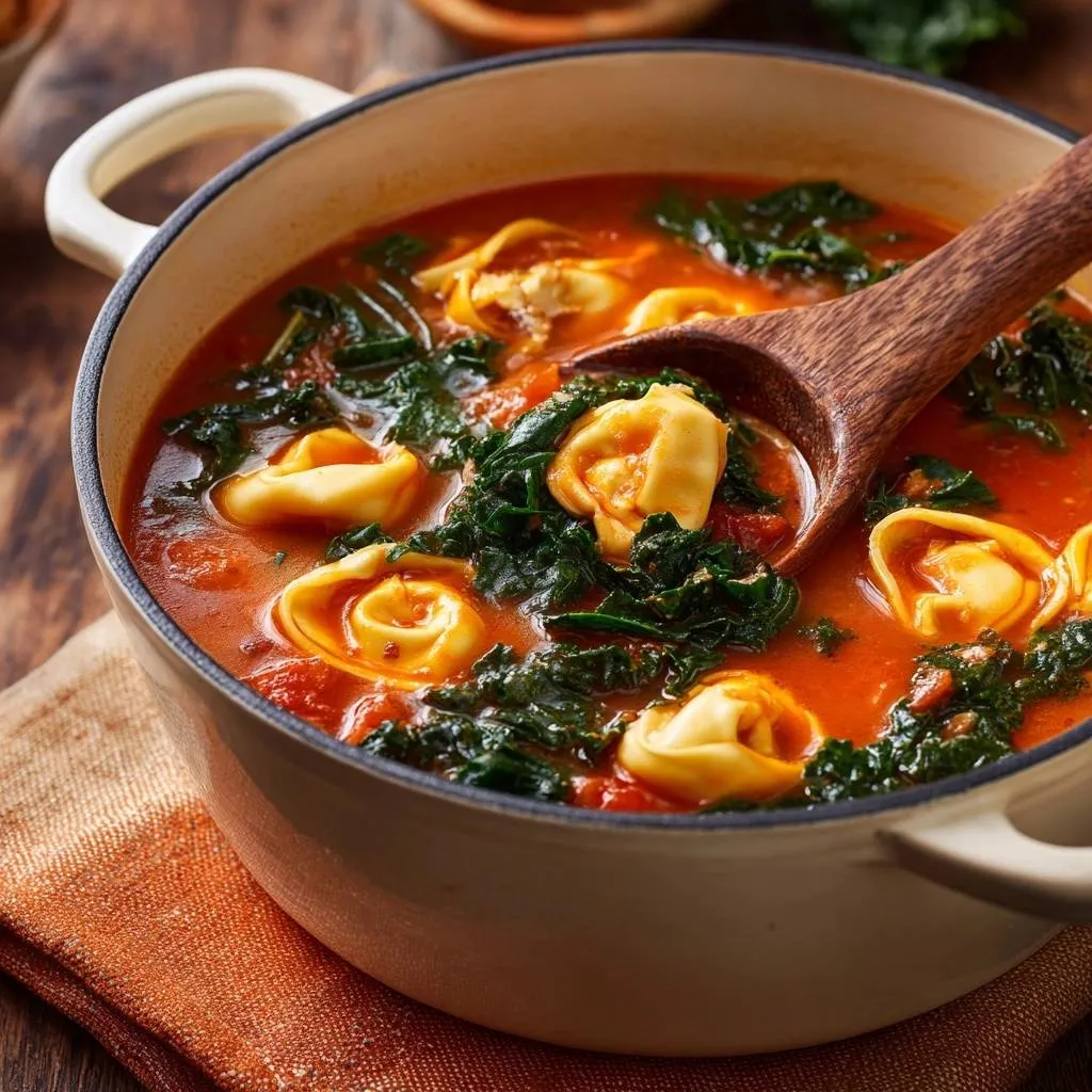 Hearty tomato kale tortellini soup with perfectly firm tortellini. Cook pasta separately to avoid mushiness and enjoy al dente texture in every bite.