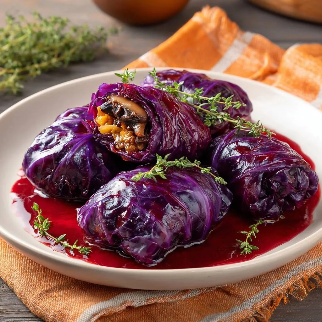 Tender red cabbage leaves stuffed with a rich, dry mushroom filling, baked in a glossy tomato-balsamic sauce. No watery sogginess thanks to high-heat sauté technique!