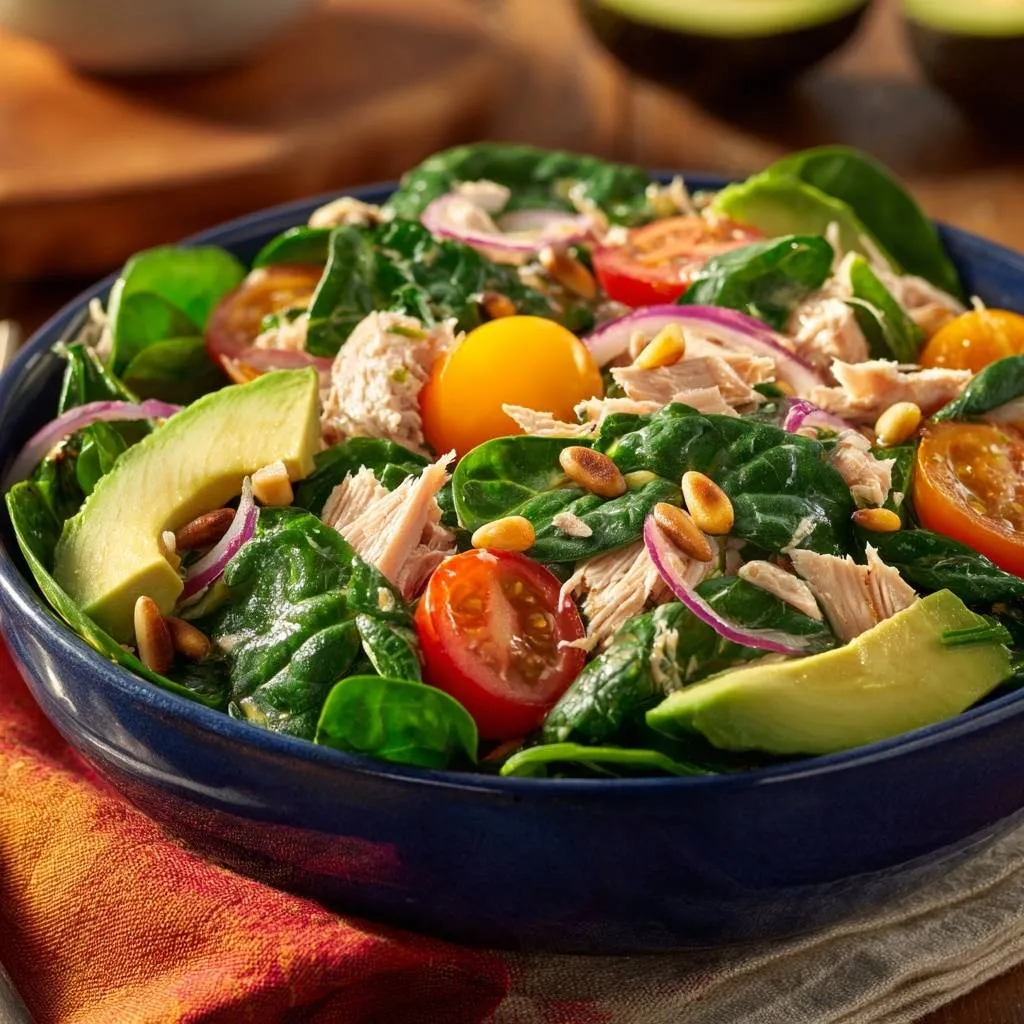Crisp spinach chicken avocado salad with toasted pine nuts, runny egg, and foolproof anti-soggy technique using salted tomatoes and onions.